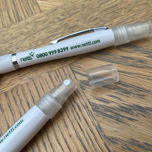 Our Spray Ballpoint Pens have a refillable sprayer with a protective cap, suitable for filling with a sanitising liquid to sanitise hands and disinfect surfaces whilst on the go.